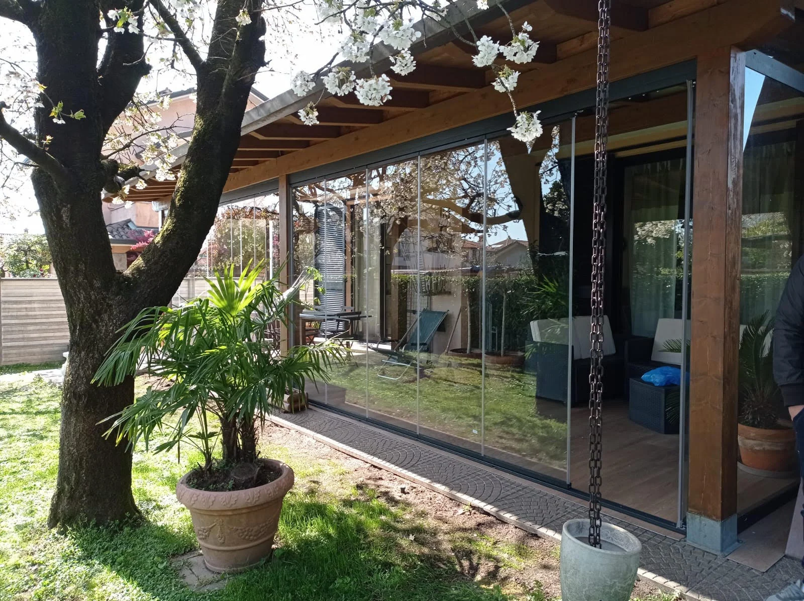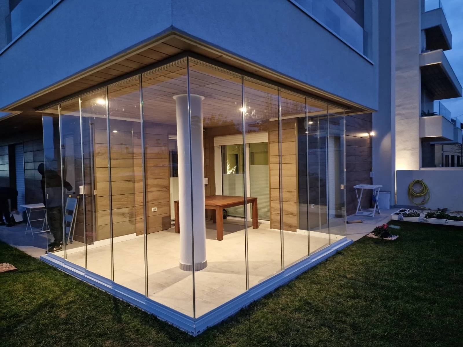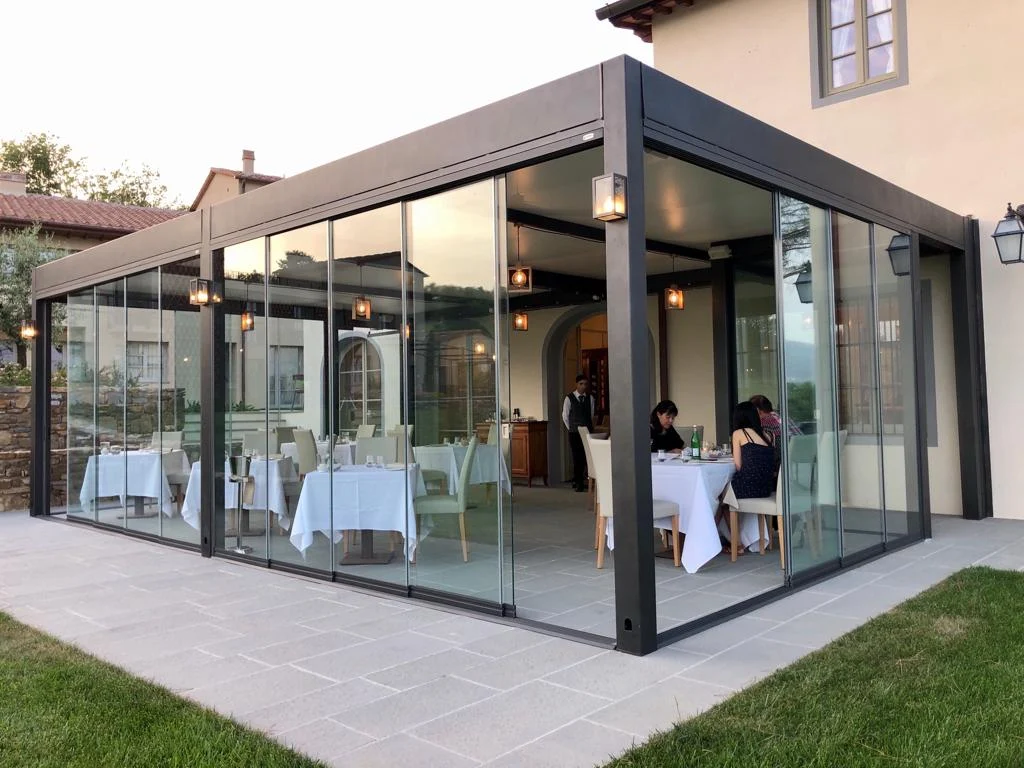 Grazie al sistema di scorrimento fluido, queste vetrate permettono di gestire l’apertura in modo versatile, garantendo protezione dal vento e dagli agenti atmosferici senza appesantire l’estetica dell’edificio.